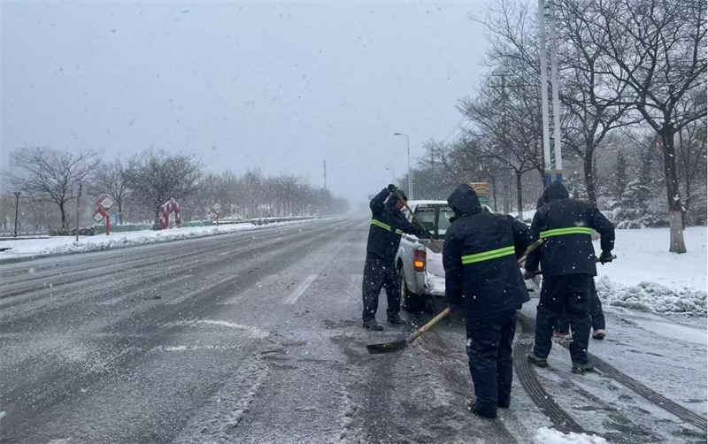降雪后,按照“雪隨下隨清”的原則,待命隊(duì)員迅速行動(dòng),在包保路段通過(guò)滾刷鏟雪、撒布融雪劑、人工清掃等方式循環(huán)作業(yè),高效開展除雪工作。