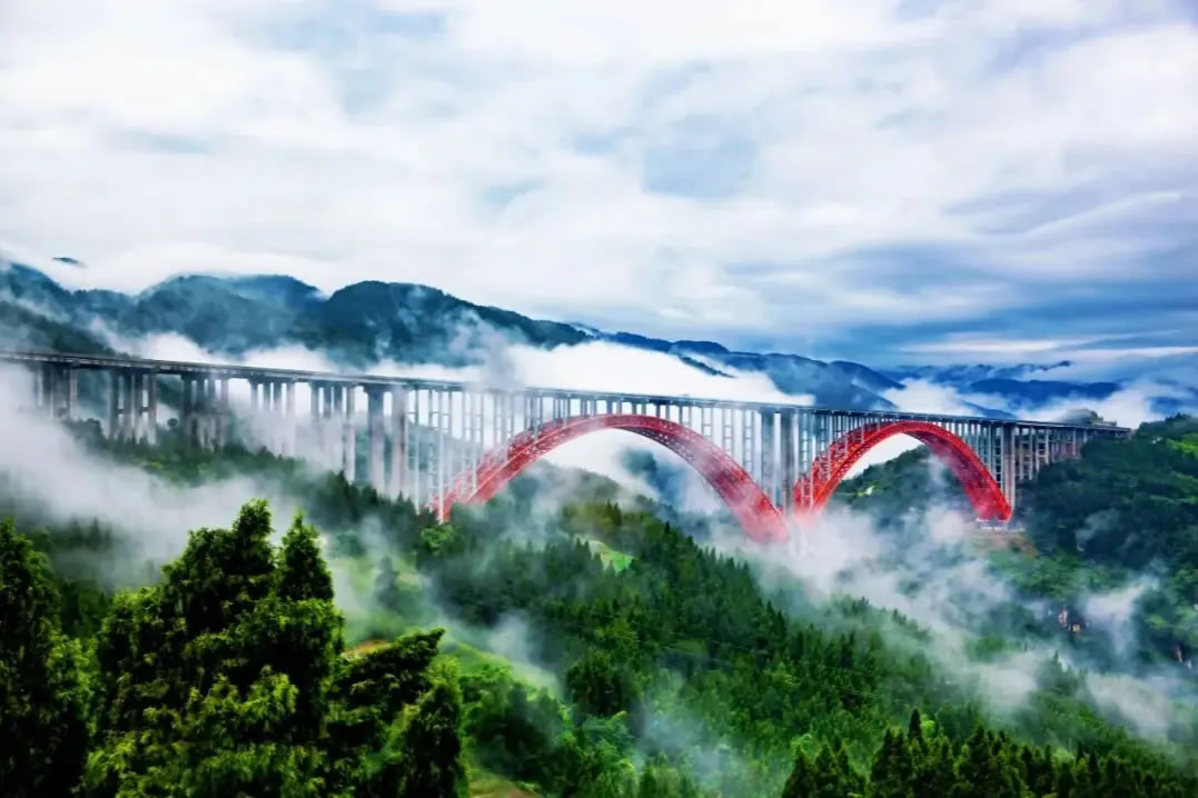 雙堡特大橋以橋與自然和諧共生之美擁抱大地、致敬自然,展示了橋梁設(shè)計(jì)的結(jié)構(gòu)藝術(shù),樹(shù)立了創(chuàng)新典范,為推動(dòng)山區(qū)橋梁工程藝術(shù)的創(chuàng)新與發(fā)展貢獻(xiàn)重慶力量。 (來(lái)源:重慶高速集團(tuán))